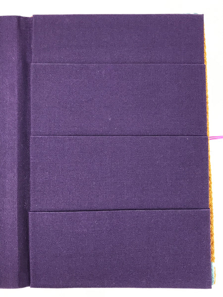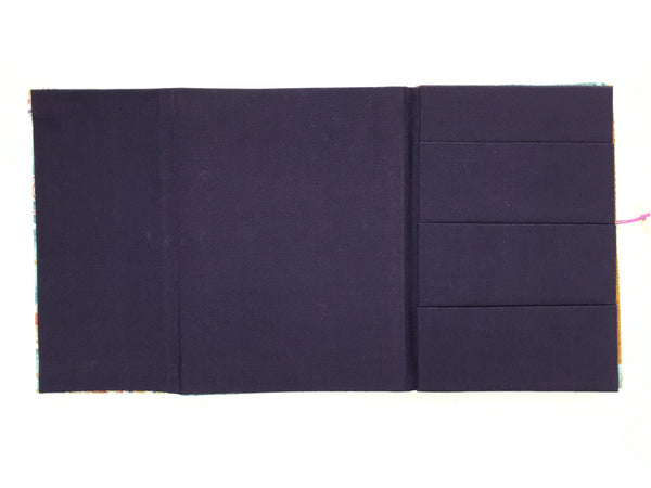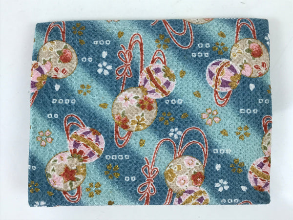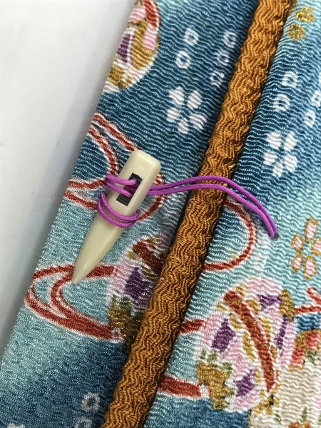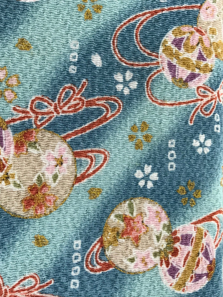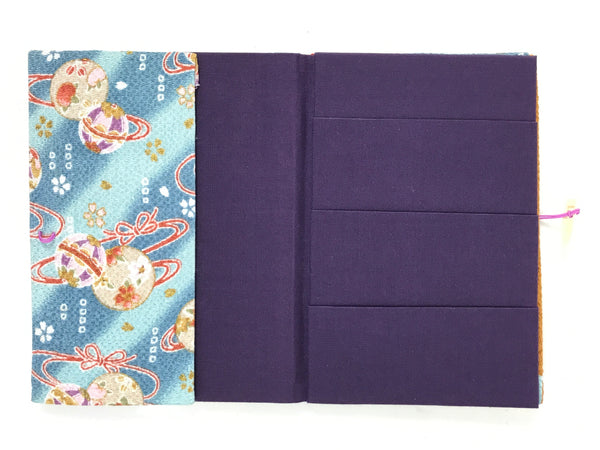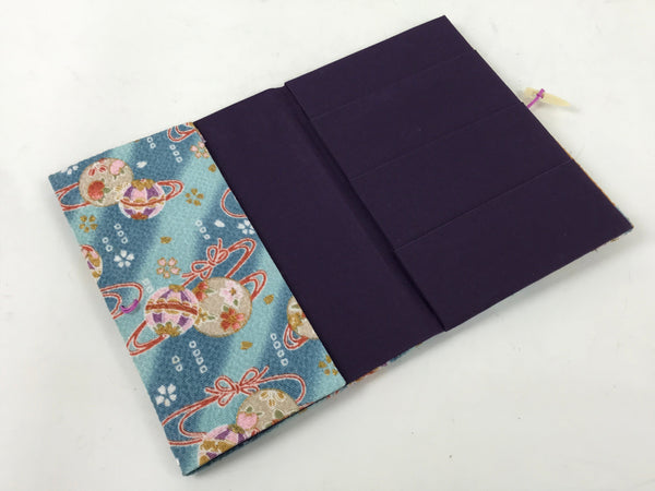 This is a vintage Japanese cushioned fabric-covered card holder. It has four places to hold cards: three small cards and one bigger one. It has a resin latch and purple string to keep it closed. The fabric outside has balls and ribbon designs in streaming-like two tones of blue color, and gold, pink, and white cherry blossoms are throughout. The fabric inside is purple.
