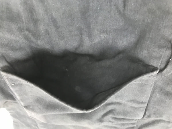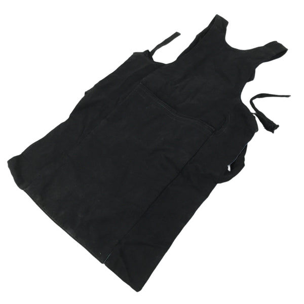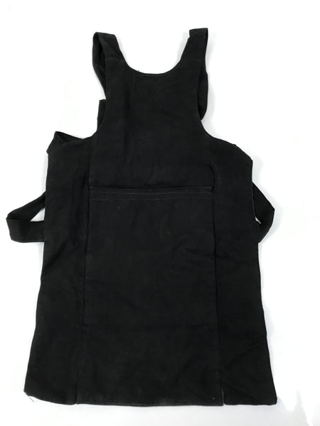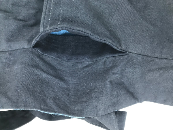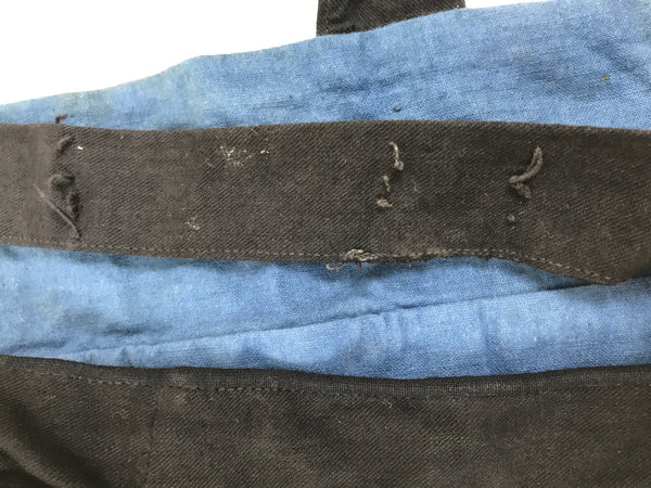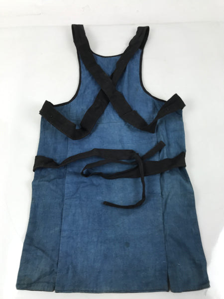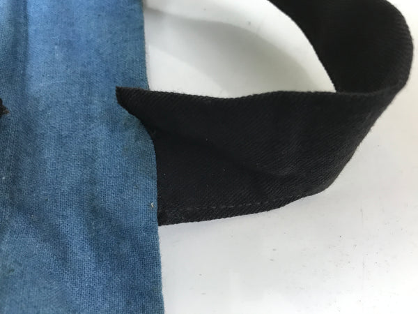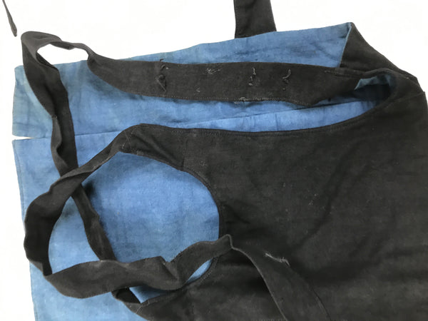 This is a vintage Japanese fireman's uniform apron, also called haragake. It is made of heavy black and blue cotton fabric with three pockets for tools. It fits small, close to the body, and over the head. Then it fastens with ties around the back of the waist. The top piece is narrower than standard aprons as to allow for better movement of the chest and arms.