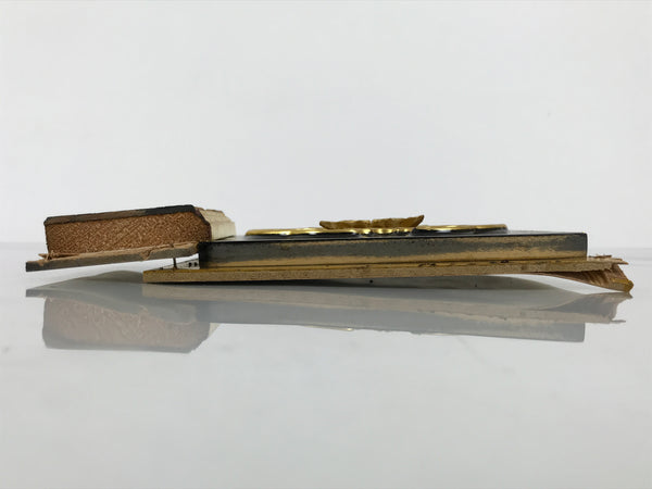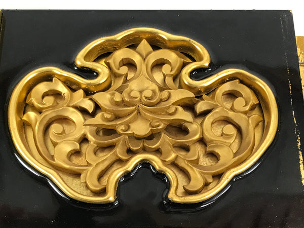 This is a vintage Japanese part of a Buddhist altar. It is a very beautiful decorative panel crafted from wood. It features a carved design of a flower among vines inside a gold and black lacquered frame. A piece attached to the side is lacquered black to match and has brass metal plates attached with a subtle plant design. This piece was originally part of a Buddhist home altar (butsudan). It can be used as a spare part, for repair, or decoration.