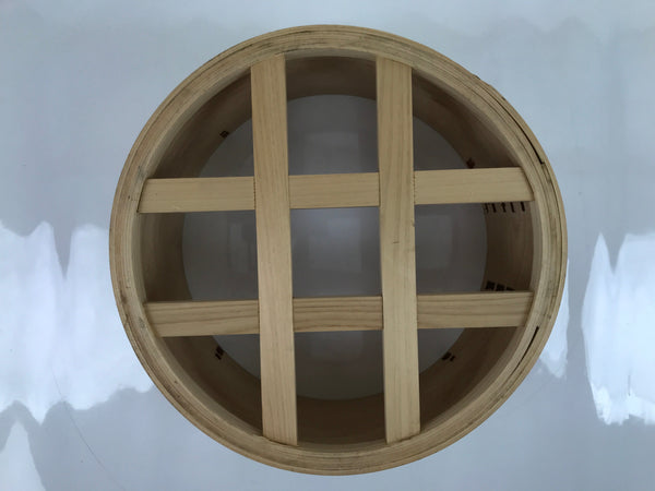This vintage Japanese wooden steamer, or seiro, is made of wood and has a mat made of bamboo on the inside. It is a natural wood brown color.