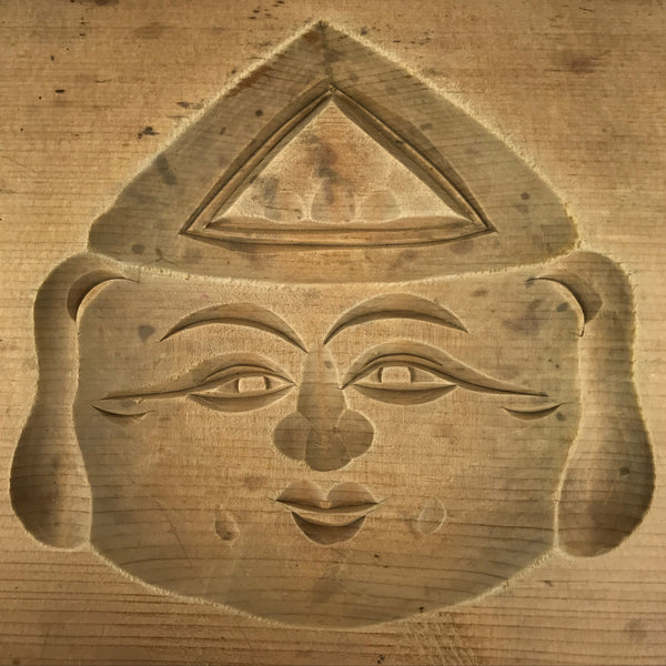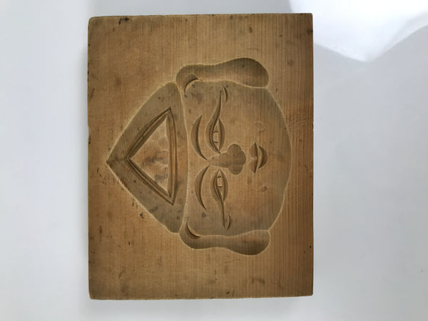 This single-panel kashigata mold is carved with the face of Ebisu, one of the Seven Lucky Gods. He is often depicted with fish and symbolizes luck in commerce as well as fishing. This mold can be used to make sweets or as an eye-catching decorative item.