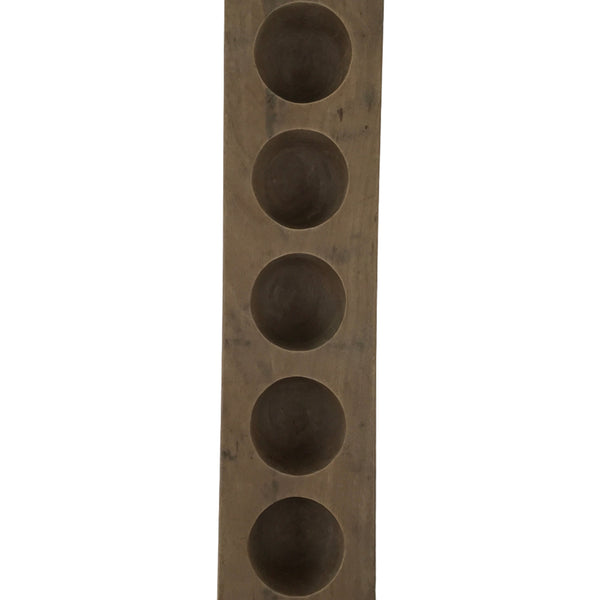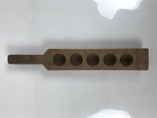 This wooden mold is one panel and in a paddle shape with five round slots that will make a half-sphere shape when used. This mold can be used to make sweets or as an eye-catching decorative item.