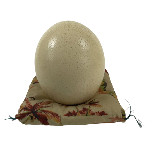 This is an African decorative ostrich egg shell most likely purchased as a travel souvenir. It is large with a hole at the very bottom. Inside is filled with what may be dried rice and sealed with tape at the bottom and acts as a weight to keep it from tipping over. The surface is a natural color and blank, easy for painting or decorating. It rests on a square pillow that depict the pyramids of Egypt.