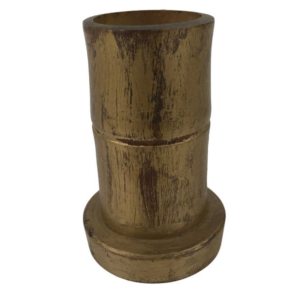 This is a combination wood and bamboo flower vase, hanatate, for Buddhist altars. This particular vase has a cylindrical shape (bamboo) with a round base (wood), and it is painted gold.