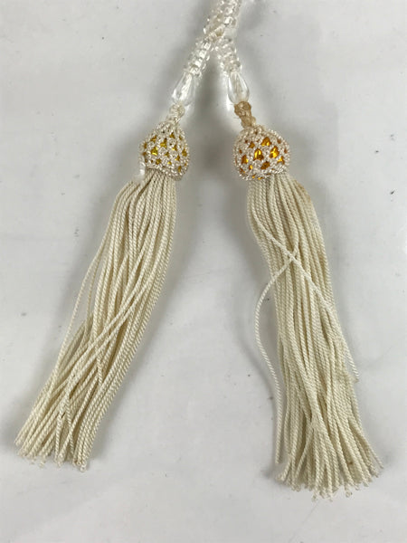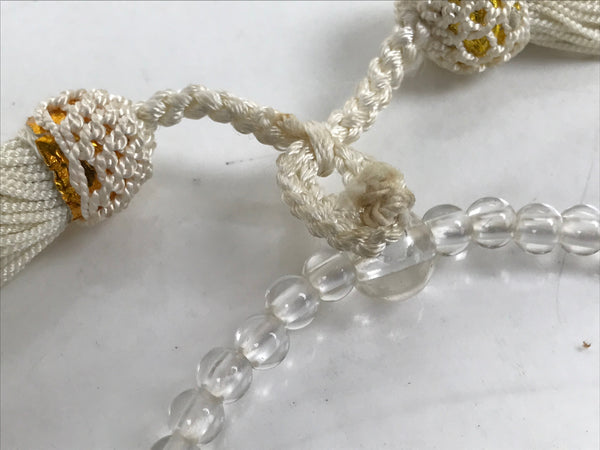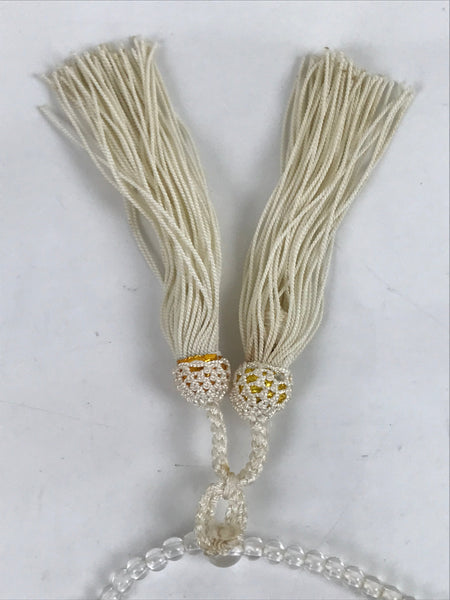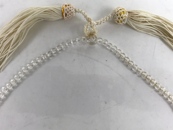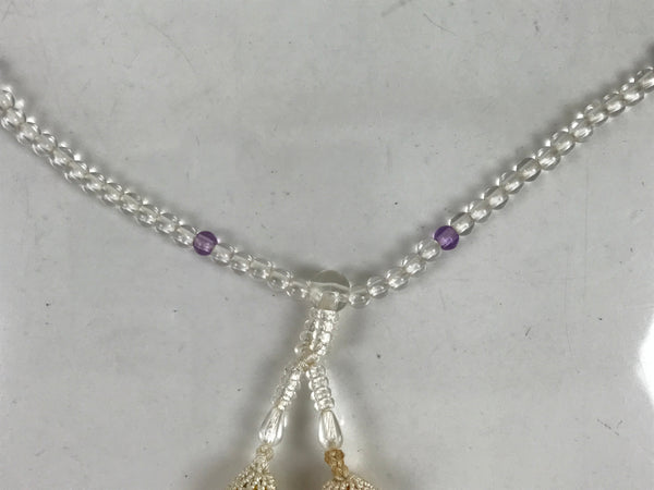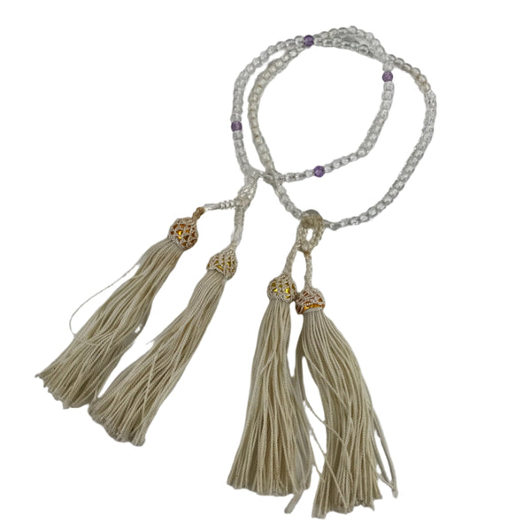 This is a vintage Japanese Buddhist prayer rosary bracelet, Juzu. It is made of small clear and purple beads. The whole chain is held together by a white string going through two transparent main beads to which are attached two white tassels.