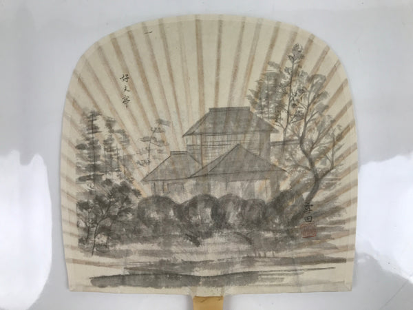 This is a Japanese vintage paper fan or UchiwaUchiwa is a traditional fan tool typically made of wood or bamboo and paper in a flat paddle-like shape. This particular fan is called a sesson uchiwa, a uniquely shaped fan with a wide, flat bottom and a thick handle. Its frame is completely bamboo and has washi paper carefully pressed onto it featuring the famous kobuntei aristocratic villa located in Ibaraki Prefecture. It is famed for its lush gardens and beautifully painted wall screens inside. This type of fan was made popular in the Muromachi Period and is still handcrafted to this day.