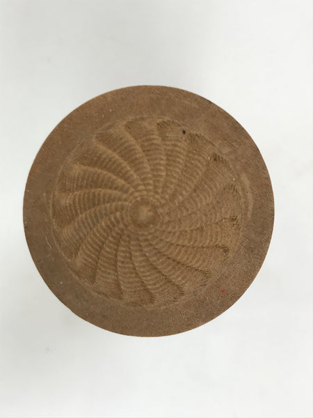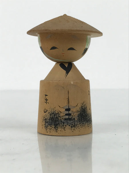 This is a vintage Japanese wooden doll figurine. It has a wobbly head with a smiling expression, wearing a hat. The figurine's body is a wooden cylinder, and it features a painting of a pagoda and Japanese letters, part of the Gion-kouta song.
