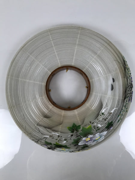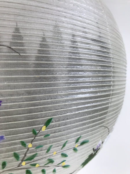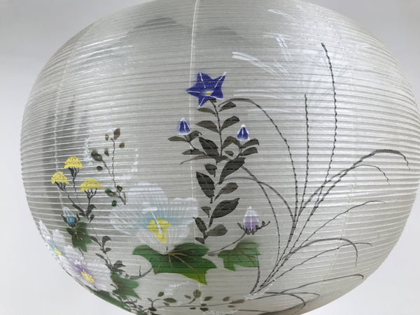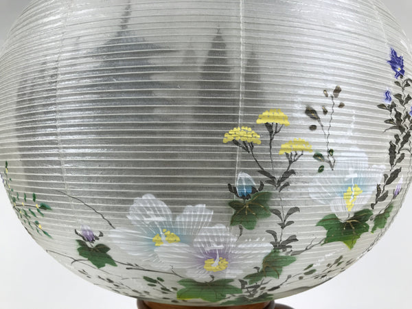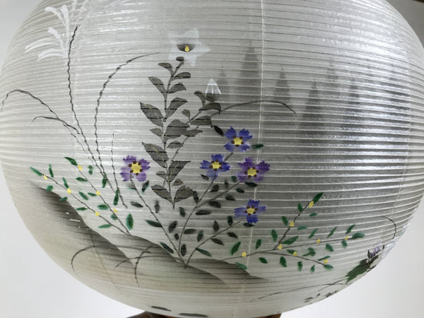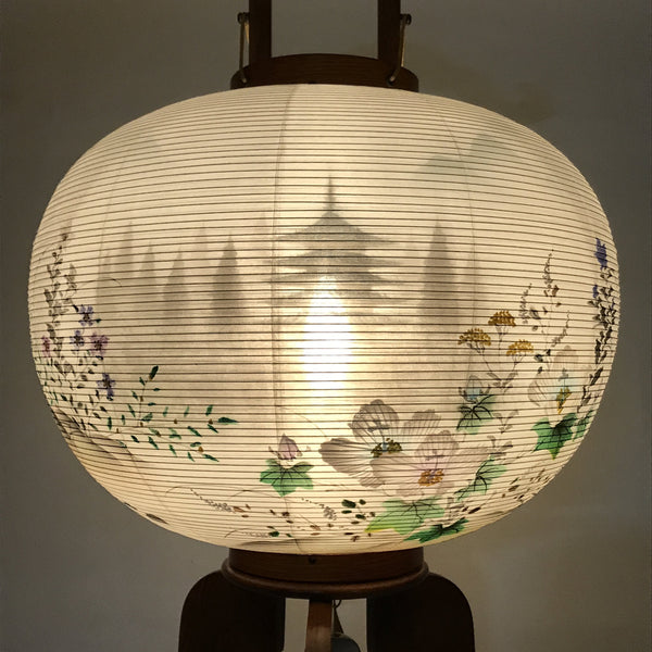 This is a vintage Japanese lantern made from silk, decorated with white fuyo flowers (a type of hibiscus), purple kikyo bell flowers, and yellow flowers. The background features trees and a pagoda. The lantern fits on a 3-legged brown wooden stand. This type of lantern is usually used as a display during the Obon summer festival. This lantern flattens and is easily stored in the matching box.