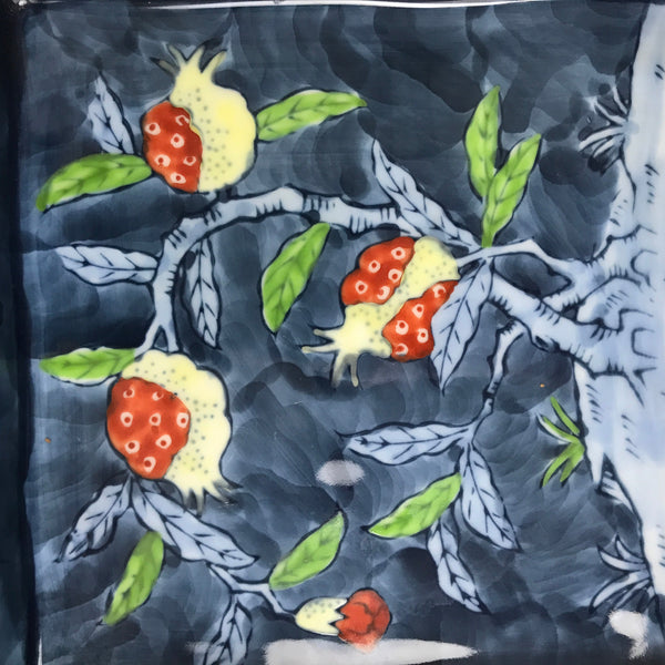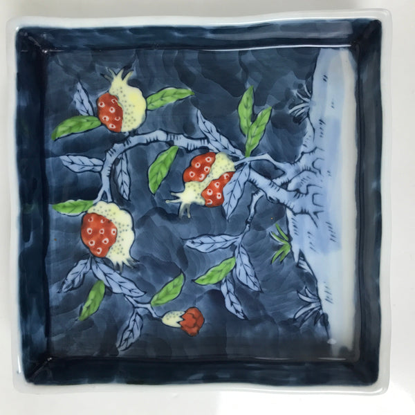 This vintage Japanese square serving dish is blue with a beautiful design of a pomegranate tree with fruits. This square plate has a medium size and it is signed on the bottom. It is great for serving sashimi, side dishes, some sweets, and so on.