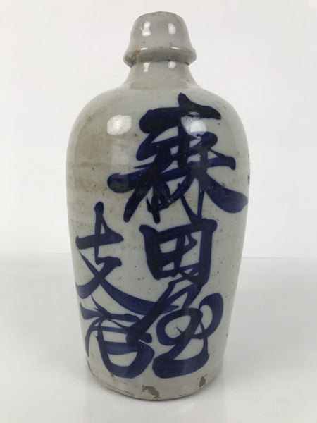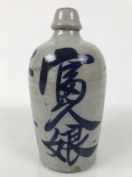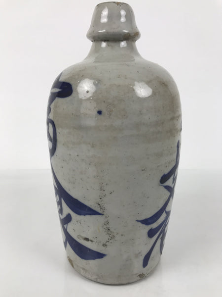 This is a vintage Japanese ceramic sake bottle. It is called a Kayoi-Tokkuri and is used to pour sake. The commuting sake bottle became popular as a rental container for liquor stores in the Edo period when sake began to be consumed daily. This gray bottle has blue lettering.