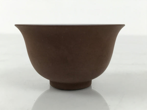 This is a vintage Japanese porcelain sake cup. This particular type of cup is called tsubomi or "bud type" due to its resemblance to a flower bud. In terms of size, it is also called ochoko. It has a matte brown outside with a smooth white inside and no other designs or embellishments.