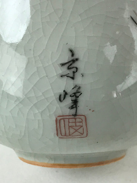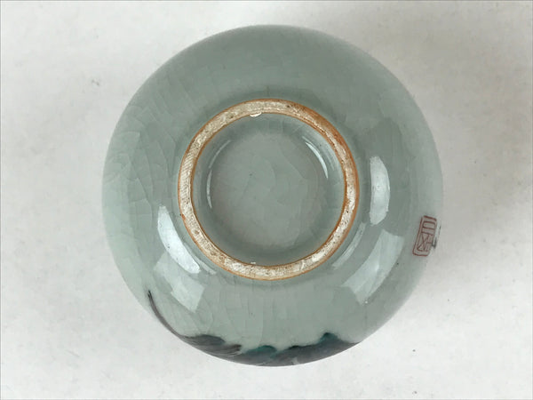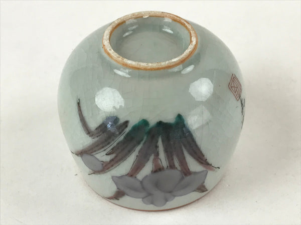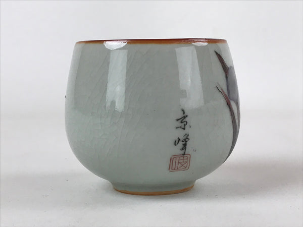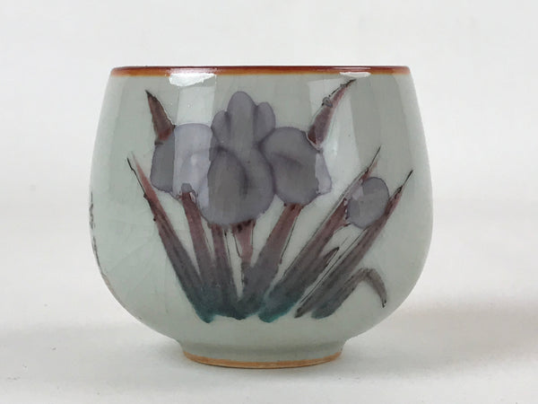 This is a Japanese vintage tea cup (Yunomi). It has a beautiful white (light gray) crackle glaze with an illustration of an iris flower in purple, green and brown on top and a reddish orange mouth. It is signed on the side. This cup can be used during the tea ceremony or as a small bowl to serve side dishes.