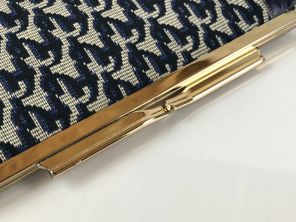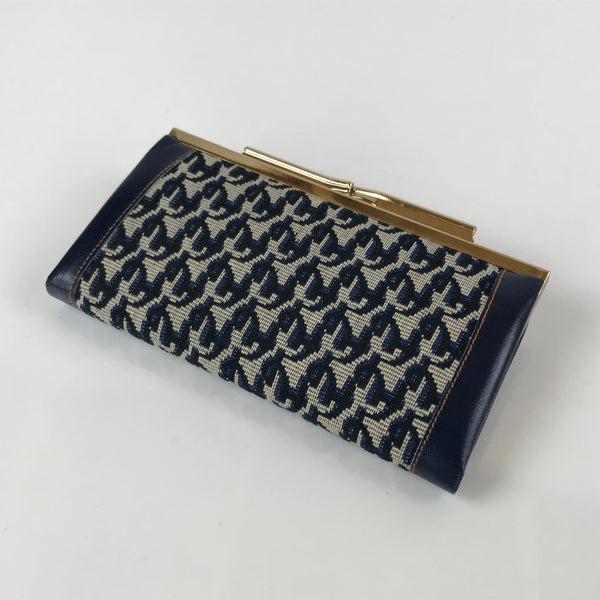 This is a Japanese clutch wallet with a woven dark blue and beige pattern on the outside as well as blue faux leather accents. It features a gold-colored "gamaguchi" kiss-lock clasp. Inside is two separate pockets with a narrow third one between them. The fabric inside is a rich emerald green. Original box is included.