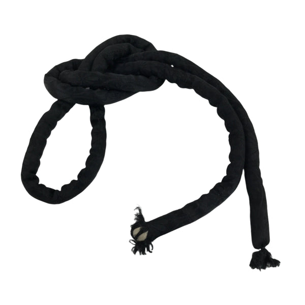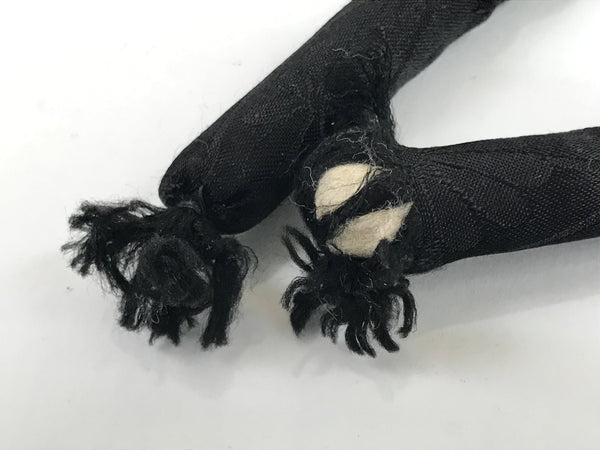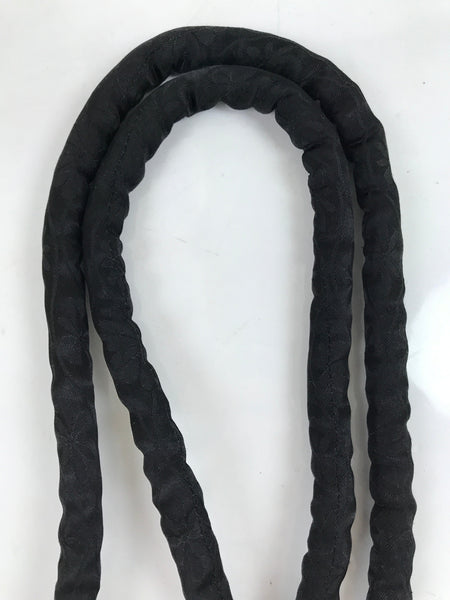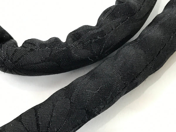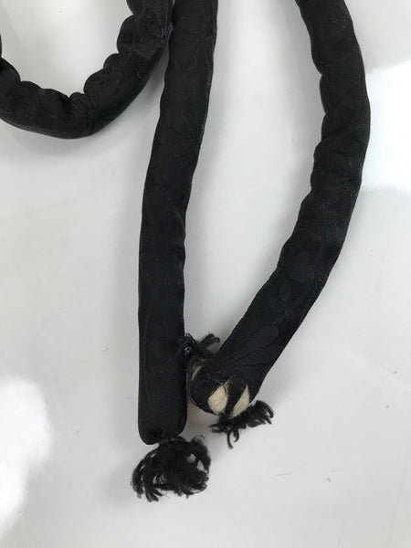 This is a Japanese vintage obijime. This particular style is called marukuge and is made of silk cloth with plush stuffing and short end tassels. It is an alternative to standard braided obijime. A solid black with a subtle floral pattern, this cord is flexible and easy to tie.