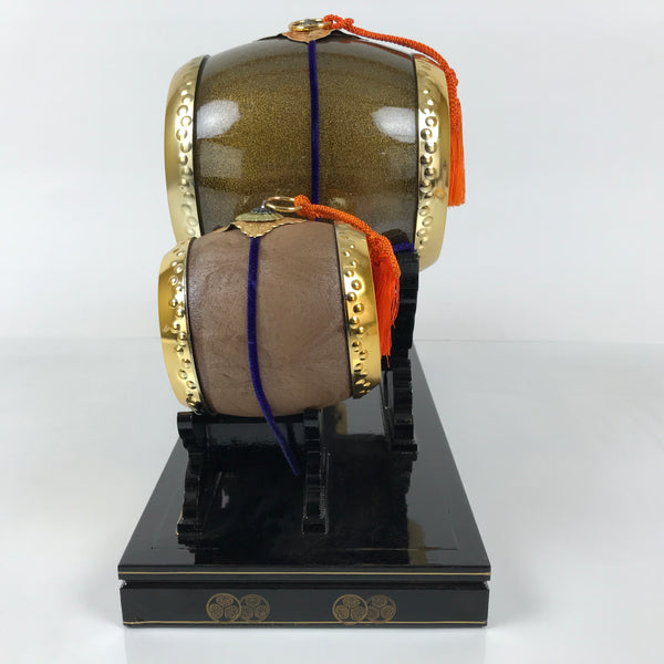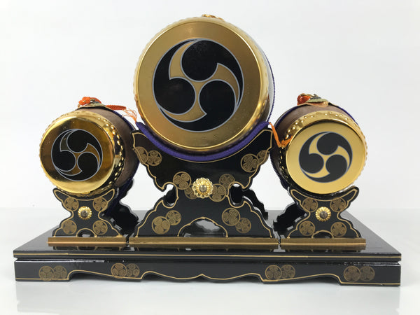 This is a vintage Japanese taiko drum display set out during Boys' Day (also known as Children's Day). This amazing, eye-catching set has three drums resting on a black lacquered stand. The main drum has a sparkling brown and gold body with gold resin heads as well as orange braided silk tassels. The smaller drums have a matte wood-like surface with gold resin heads as well.  All drum bodies are made of resin and have a spiral mon/kamon symbol on the front side. The stand is made of wood and lacquered a glossy black with gold painted designs of more round mon symbols. There are small metal chrysanthemum decorations on the front side of the stand.