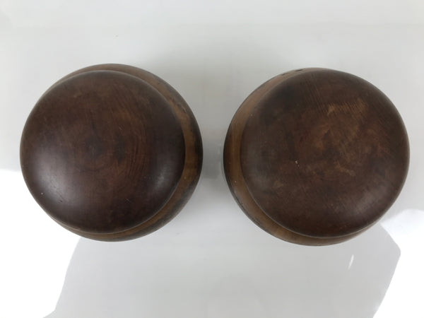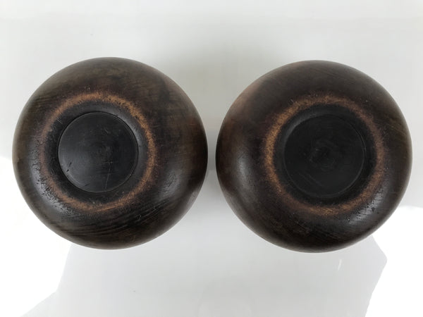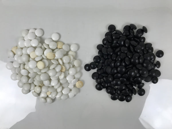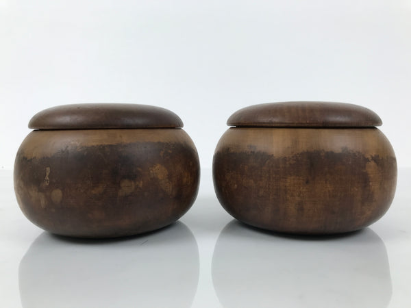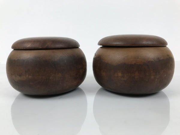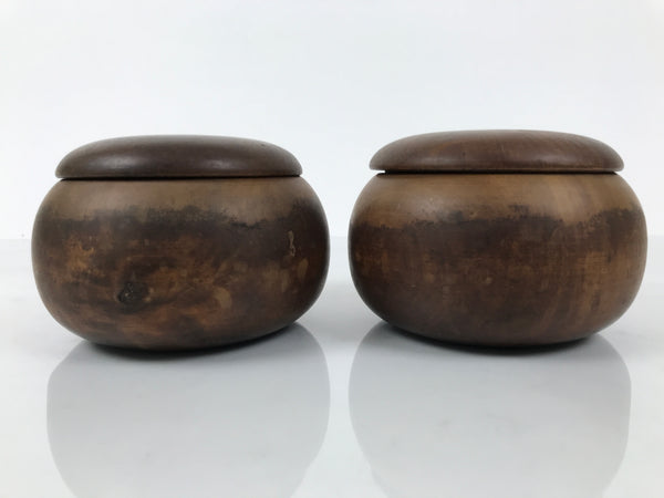 This is a vintage goishi, or go stone, set used to play the popular strategy board game Igo, or Go. This beautiful set of game pieces made from black and white glass is contained in lidded dark brown wooden bowls for easy, decorative storage.