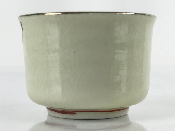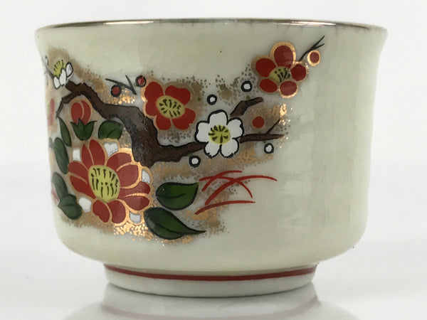This is a vintage Japanese porcelain sake cup. This particular type of cup is called tsubomi or "bud type" due to its resemblance to a flower bud. In terms of size, it is also called guinomi. This cup has a beige crackle glaze featuring red and white cherry blossoms on branches. There are gold accents throughout as well as on the top rim. There is a red maker's stamp on the bottom.