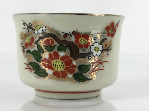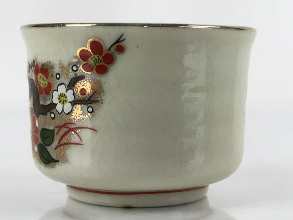 This is a vintage Japanese porcelain sake cup. This particular type of cup is called tsubomi or "bud type" due to its resemblance to a flower bud. In terms of size, it is also called guinomi. This cup has a beige crackle glaze featuring red and white cherry blossoms on branches. There are gold accents throughout as well as on the top rim. There is a red maker's stamp on the bottom.