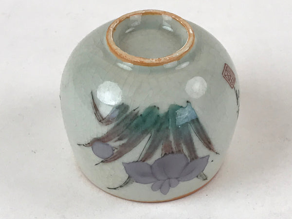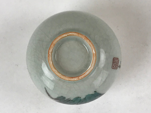 This is a Japanese vintage tea cup (Yunomi). It has a beautiful white (light gray) crackle glaze with an illustration of an iris flower in purple, green and brown on top and a reddish orange mouth. It is signed on the side. This cup can be used during the tea ceremony or as a small bowl to serve side dishes.