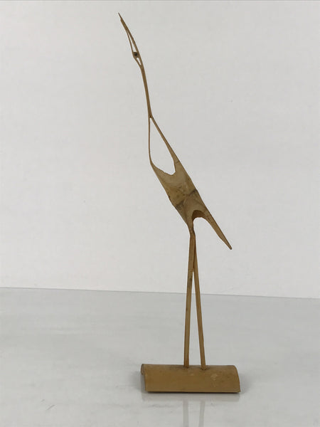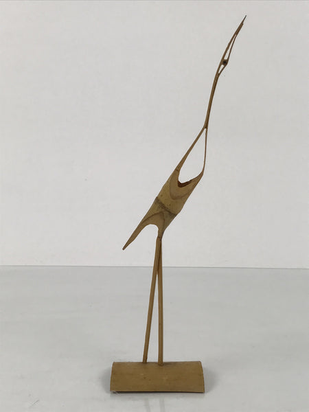 This vintage Japanese bamboo kokeshi figurine represents a crane. This skinny crane is made from a piece of bamboo, just cut and bent,  and it stands on a bamboo stand.