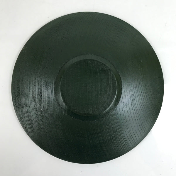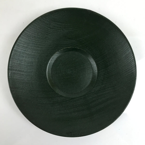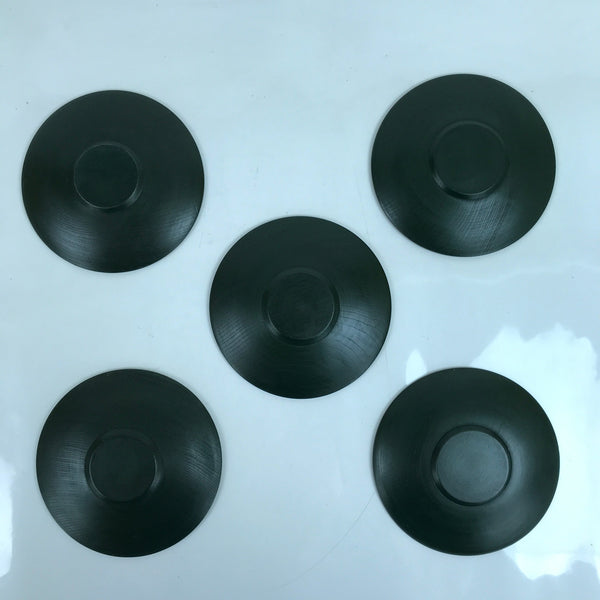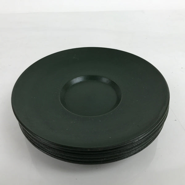 This is a five-piece set of vintage Japanese wooden lacquered drink saucers/coasters, or chataku. Coated in a matte deep green lacquer paint on lightweight wood, this easily stackable set is a simple, classic style. It has an indentation at the center to keep a cup from slipping off and a ringed design.