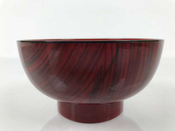 This is a vintage Japanese soup bowl, owan, typically used for serving rice, miso soup, or other kinds of soup.  This lacquerware replica bowl is red and has a design on the outside, resembling a brushed mark with black ink. This easy-to-use bowl is a good addition to a traditional Japanese dinnerware set.