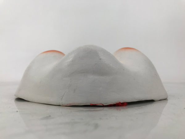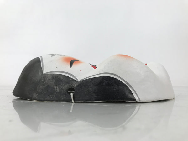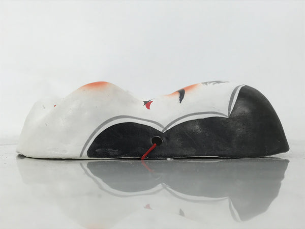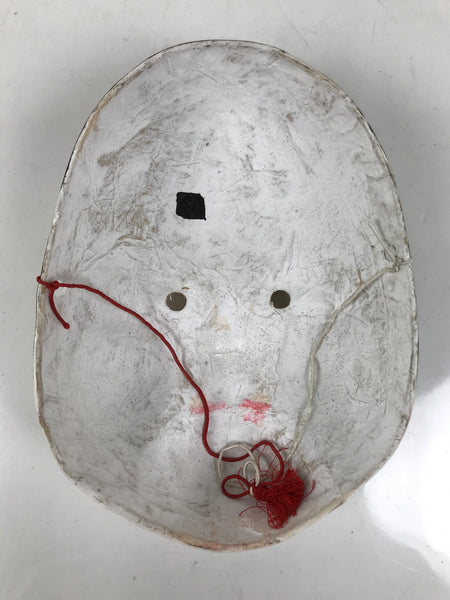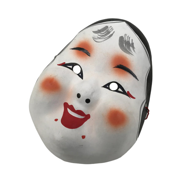 This is a vintage Japanese paper mache noh mask (noh-men). This character is the face of a woman named Okame or Otafuku. Okame is a smiling woman with a round face, a low and round nose, drooping hair, and round and protruding cheeks (high cheeks). She is said to bring happiness and good fortune to any man she marries. The mask is fully painted in white, black, and red. It can be used for all kinds of home and office decor.
