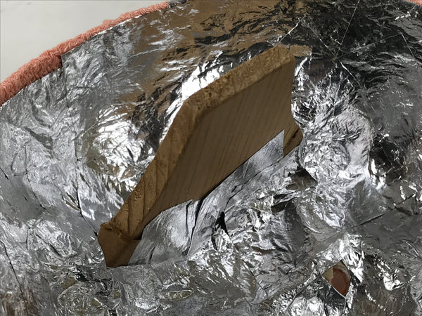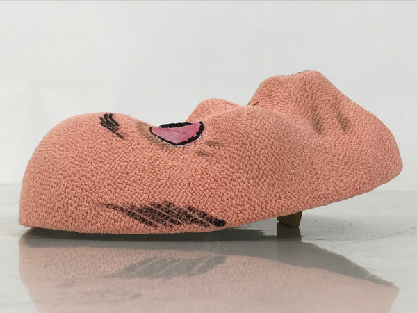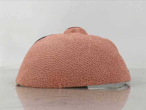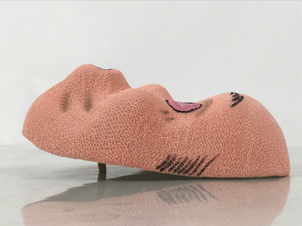 This particular mask is unique, covered in a pinkish chirimen silk fabric and painted over with details. It has no holes for a string, but instead a wooden piece where the performer can hold the mask up with their mouth. The inside of the mask is lines with some sort of aluminum tape or paper.