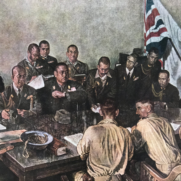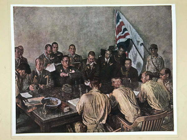 This is a vintage Japanese machine-printed reproduction of military art by Miyamoto Saburo. The piece is called 'Meeting of Generals Yamashita and Percival'. It represents men meeting around the table in Singapore in 1942. The piece is placed on a piece of cardboard with a protective sheet of paper on top, with explanations in Japanese.