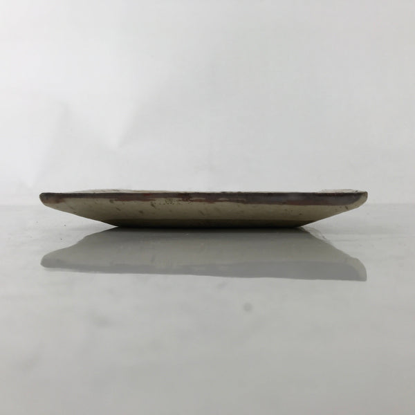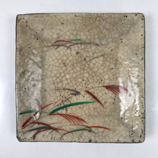This vintage Japanese small square plate is made of ceramic pottery and has a bumpy, pocked, crackled beige glaze. The overall design features elegant green and red-colored susuki (obana) grass, also known as Japanese pampas grass. This type of plate is called meimeizara and is the perfect size to serve wagashi, traditional Japanese sweets. It also serves as a plate for side dishes in a Japanese meal set.