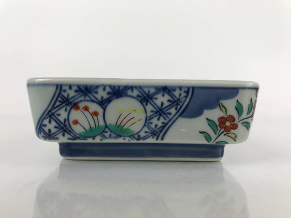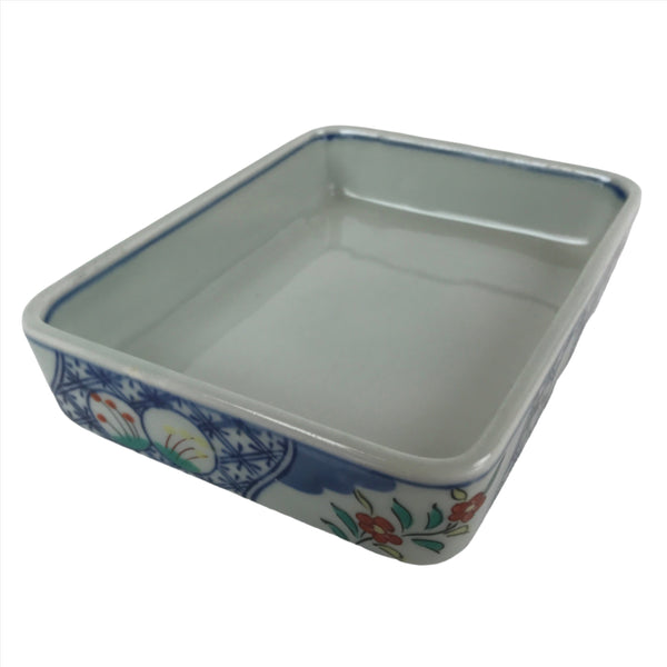 This is a vintage Japanese porcelain plate. This rectangular, small plate, also called kozara, is white with blue, red, and yellow and features floral blooms and buds on the outer sides. Kozara are often used for side dishes and serving desserts. This particular plate is most likely used for single servings of sashimi. There is a maker's stamp on the bottom.
