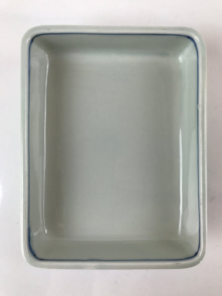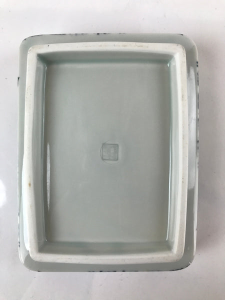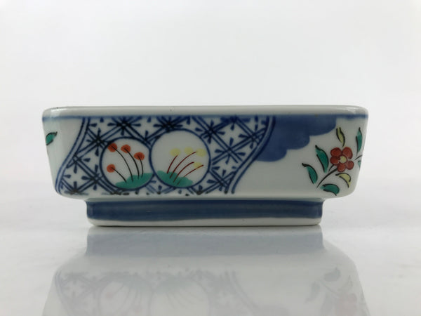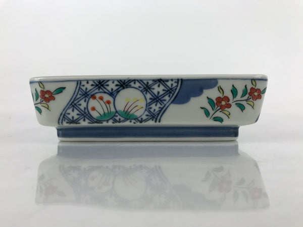 This is a vintage Japanese porcelain plate. This rectangular, small plate, also called kozara, is white with blue, red, and yellow and features floral blooms and buds on the outer sides. Kozara are often used for side dishes and serving desserts. This particular plate is most likely used for single servings of sashimi. There is a maker's stamp on the bottom.