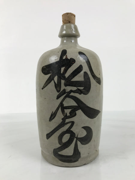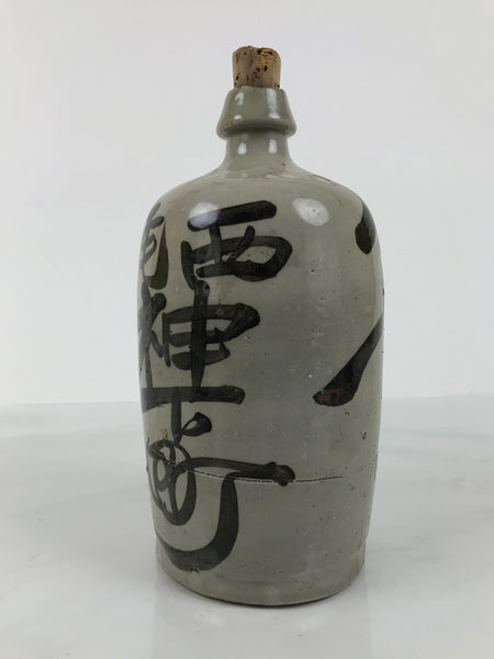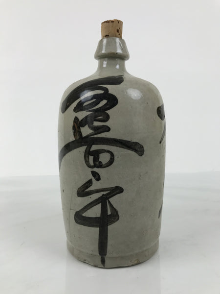 This is an antique Japanese ceramic sake bottle. It is called a Kayoi-Tokkuri and is used to pour sake. The commuting sake bottle became popular as a rental container for liquor stores in the Edo period when sake began to be consumed daily. This gray bottle has black characters. It has a cork.