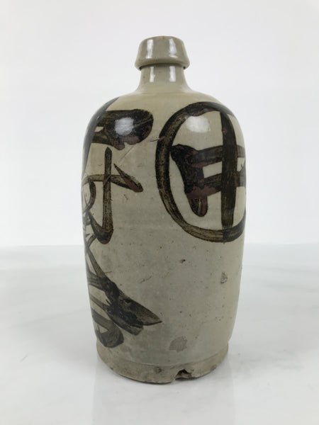 This is an antique Japanese ceramic sake bottle. It is called a Kayoi-Tokkuri and is used to pour sake. The commuting sake bottle became popular as a rental container for liquor stores in the Edo period when sake began to be consumed daily. This gray bottle has brown characters.