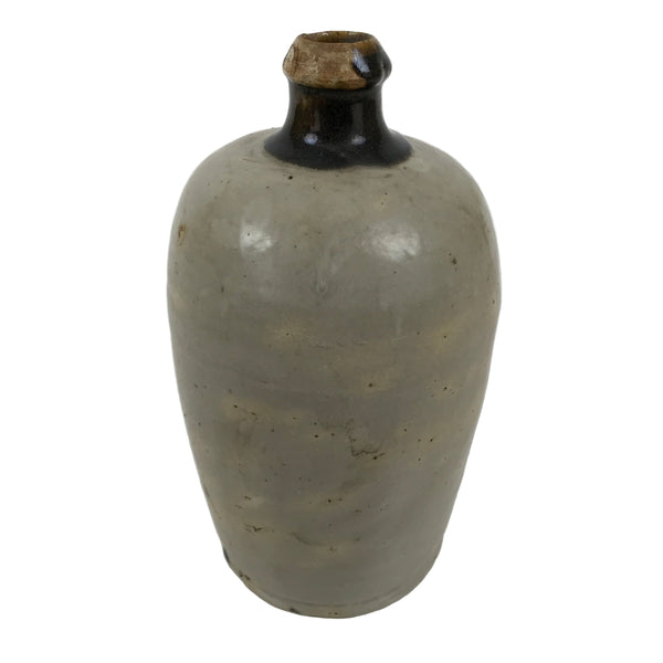 This is an antique Japanese ceramic sake bottle. It is called a Kayoi-Tokkuri and is used to pour sake. The commuting sake bottle became popular as a rental container for liquor stores in the Edo period when sake began to be consumed daily. This gray bottle has a dark brown glaze around the neck.