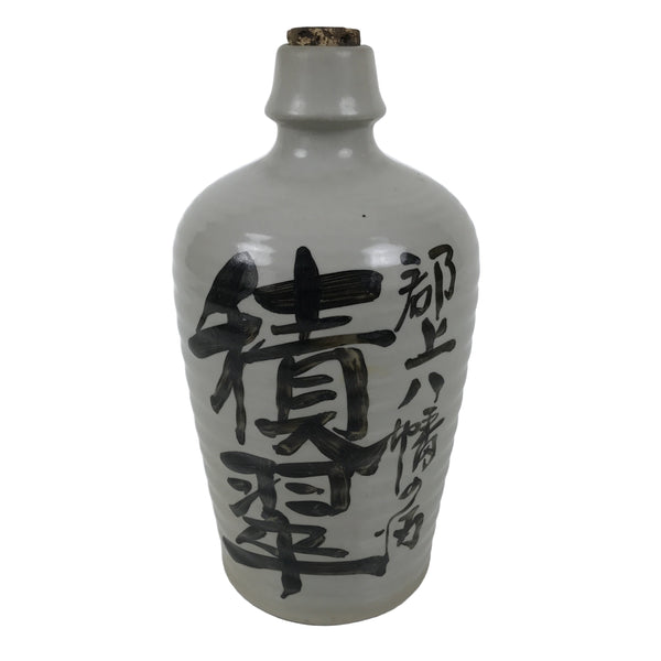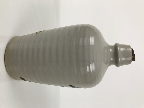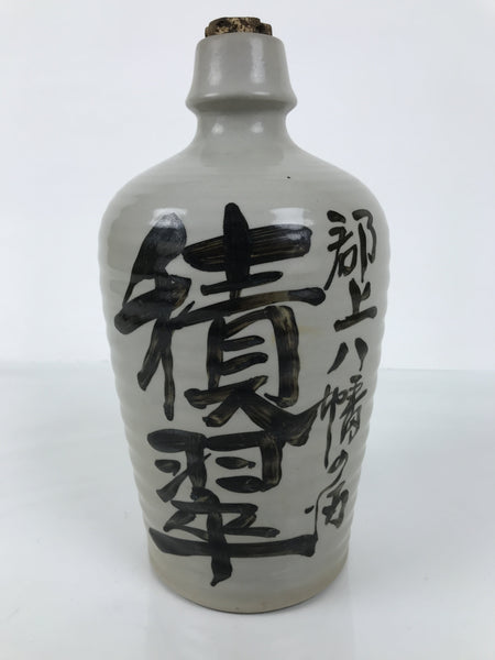 This is a vintage Japanese ceramic sake bottle. It is called a Kayoi-Tokkuri and is used to pour sake. The commuting sake bottle became popular as a rental container for liquor stores in the Edo period when sake began to be consumed daily. This gray bottle has brown lettering and a cork on the top opening.