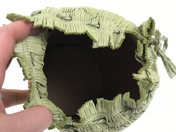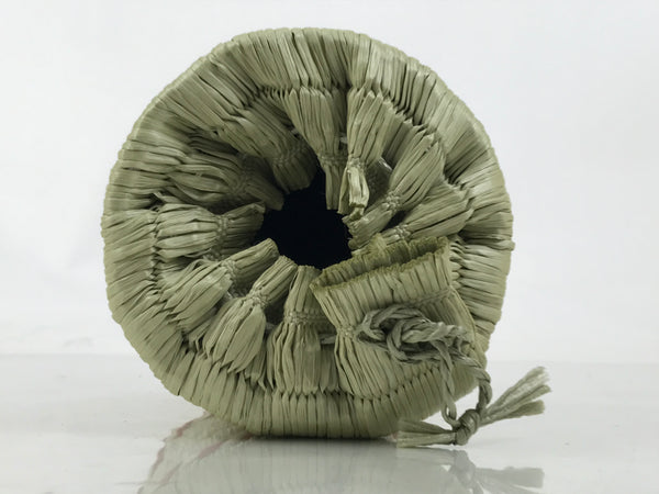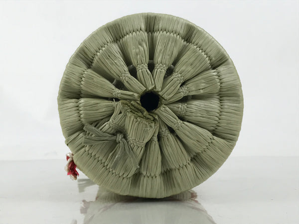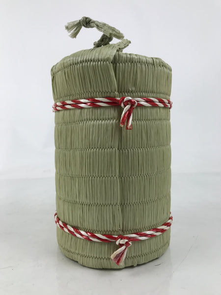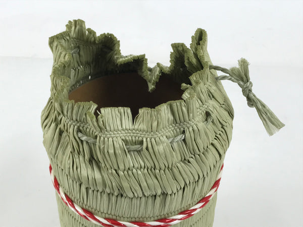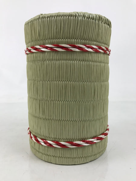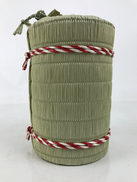 This is a vintage Japanese sake bottle cover/sleeve in the shape of a traditional komodaru barrel. Wrapped in an imitation straw woven mat, it is constructed from a sturdy paper cylinder with a removable bottom. The mat is tied with a traditional Japanese color combination of red and white resin bands.  The top is open and can be closed by a drawstring.