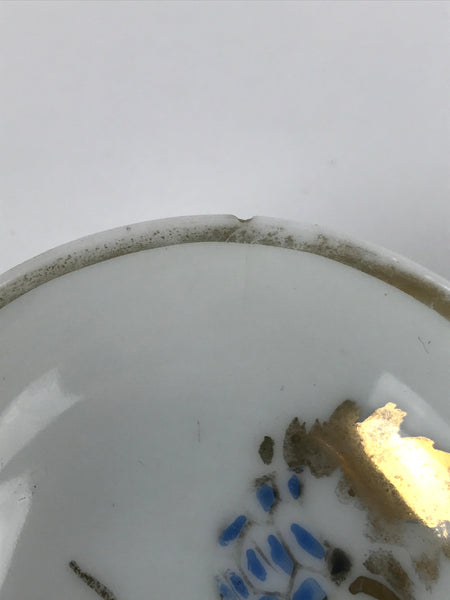 This is a vintage Japanese porcelain sake cup. This particular type of cup is called a sakazuki, a wide-mouthed sake cup often used for ceremonial purposes. Sakazuki typically only holds a couple of sips of sake. This white cup is painted with the design of a turtle (minogame). Minogame are a legendary turtle often depicted in traditional Japanese artwork and stories with a long tail and symbolizes longevity. The turtle is colored gold, blue, and yellow and the inside rim has a worn gold band.