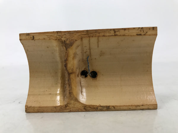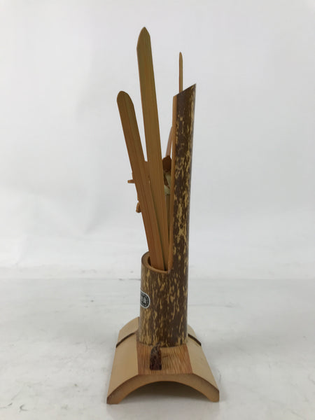 This small vintage Japanese decorative item is made entirely of bamboo and is in the shape of daffodils with leaves in a vase. It stands on a wide base with a small piece of wood for added decoration. This particular folk craft item was made in Echizen, which is a place in Fukui Prefecture.