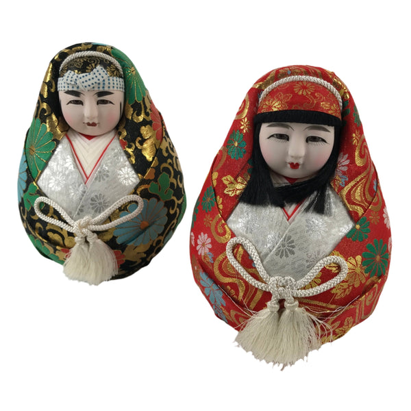 This is a vintage set of hina daruma dolls. The set contains a hime daruma, or princess wearing a beautiful red layered kimono with a chrysanthemum pattern. The other doll is called nishiki daruma, or prince, wearing a black and gold layered kimono with red and green chrysanthemums. This pair of dolls is typically given as a lucky charm for marriage and the birth of children as the hime doll was made to resemble the pregnancy of a Japanese empress. It is weighted at the bottom so that the doll stays upright.