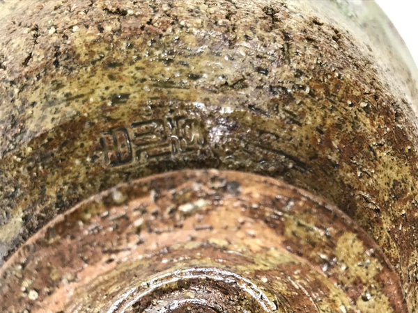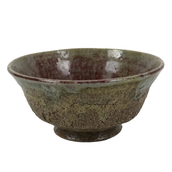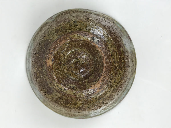 This is a vintage Japanese ceramic green tea bowl or matcha chawan. It is brown and rustic green. It has a different texture on the inside and outside: the inside is glass-glazed and smooth, while the outside is ash-glazed and rough. The rustic green glass glaze is muted with natural mottling inside, and melting over the bumpy surface outside. There is a signature around the foot.