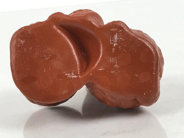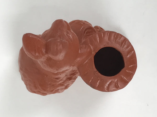 This is a vintage Japanese ceramic toothpick holder, also called youjitate. Crafted from a rich brownish-red clay and glazed the same color for strength, this Tokoname yaki piece is in the shape of a rabbit, one of the zodiac animals. It has subtle details and holds a magic hammer while sitting next to a tree stump. It has an open hole at the top for storing easily accessible toothpicks.