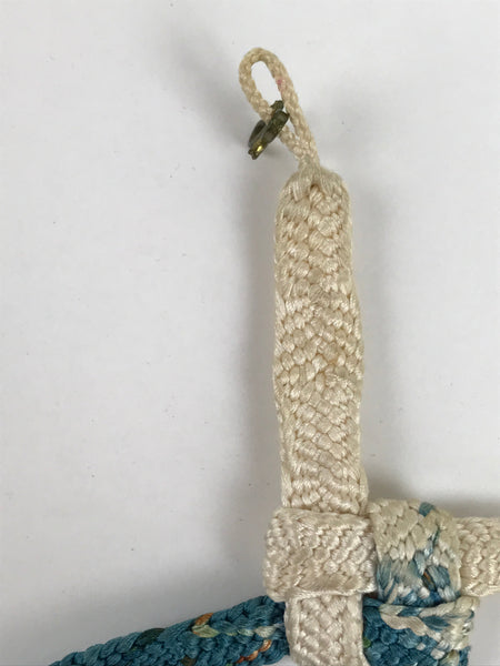 This is a Japanese vintage braided silk haori himo. One of many different styles of kumihimo cords, it is white at the top with a sky blue bottom and tassel. White and a few other colors are braided into the blue section for accent. This haori himo is made of two separate pieces that comes already knotted together in a square pattern that showcases the intricate braid pattern and mix of colors. It comes with S-hooks for attaching to the haori.