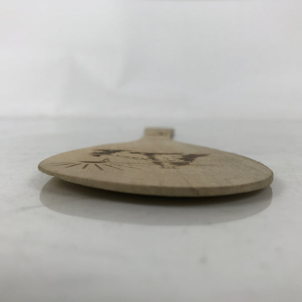 This is a vintage Japanese rice scoop or spatula (shamoji). It is a common household tool for scooping and fluffing rice as well as for spreading rice out for making sushi. It is a souvenir of Ise, Mie. It features a branded design of a famous place in Mie called Meotoiwa (wedded rocks), with sunrise and the Kanji of Ise. It is light brown and is not coated with varnish.