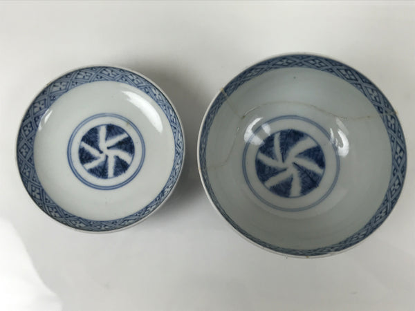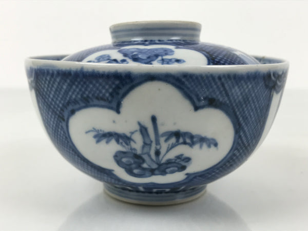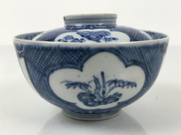 This is a Japanese vintage porcelain lidded rice bowl. The bowl is decorated with sometsuke-style dark blue shochikubai design (plum blossom, pine tree, bamboo). Shochikubai is a popular, traditional winter motif that symbolizes perseverance and renewal. The inner rim has a diamond floral pattern, and there is a spiral at the bottom of the bowl. It is the ideal size to serve soup, rice, or other small foods.