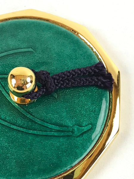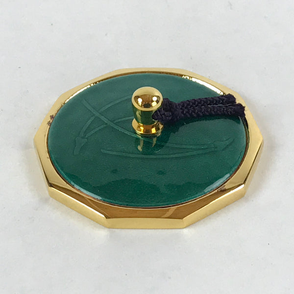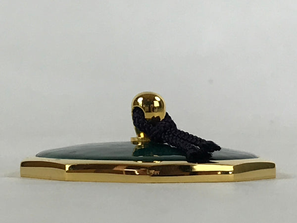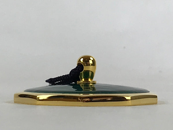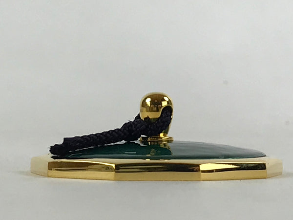 This is a vintage Japanese Shippo Cloisonne paperweight. The Shippo technique consists of glazing on top of a metal base. This paperweight has a gold color decagonal base and a beautiful emerald-green glass glaze. It has a gold color small handle where a string is attached to facilitate utilization. This compact paperweight is sold with its wooden box. This elegant and refined piece will make a perfect decoration on a home desk or on an office desk.