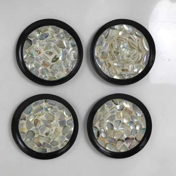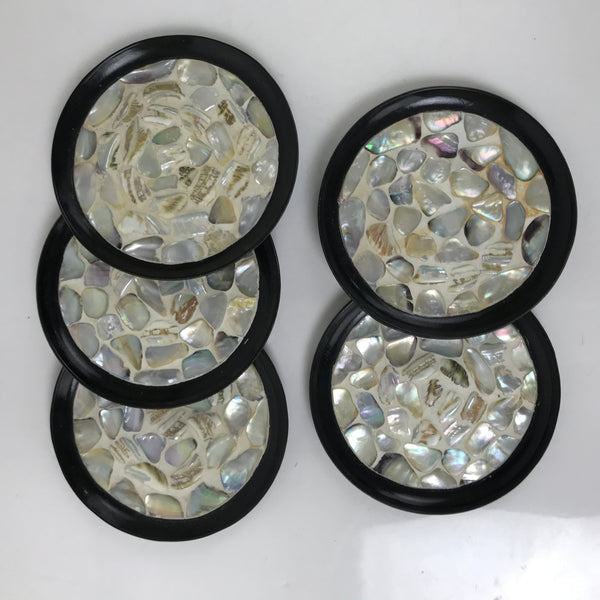 This is a five-piece set of vintage Japanese resin plastic drink saucers/coasters, or chataku. The main feature of this set is the striking abalone shell pieces that decorate the center. Set in a mosaic pattern, the shell pieces are set in light ceramic or putty clay and dried into place. The set stacks neatly.