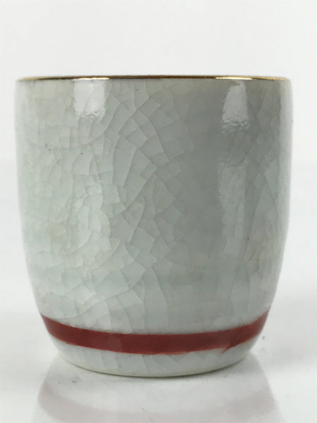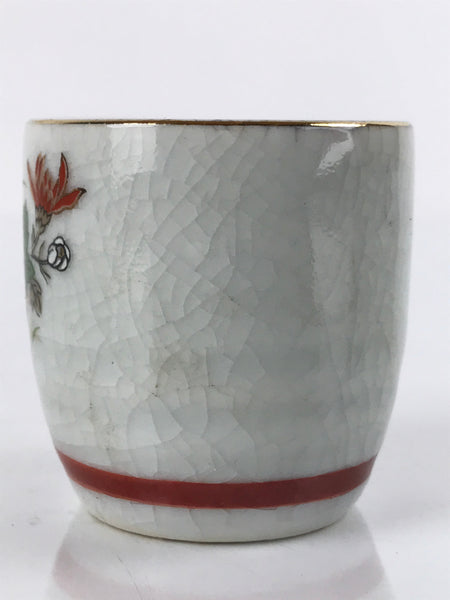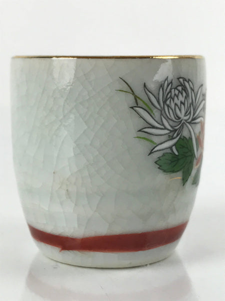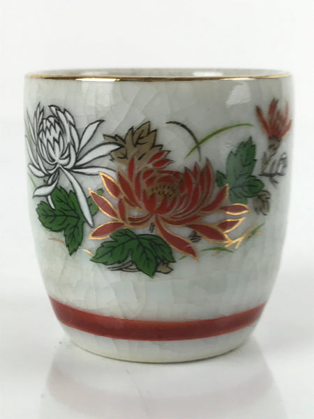 This is a vintage Japanese porcelain sake cup. This particular type of cup is called tsubomi or "bud type" due to its resemblance to a flower bud. In terms of size, it is also called ochoko. This cup is a white crackle glaze with painted chrysanthemums (white and red) with a red band on the bottom and gold rim.