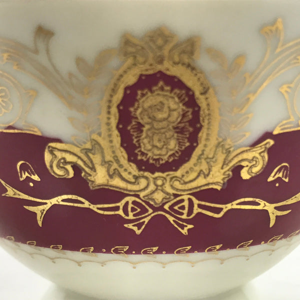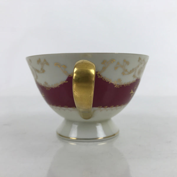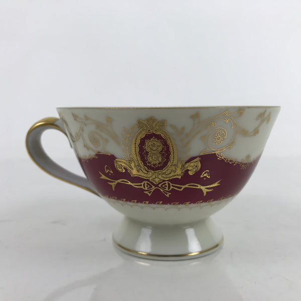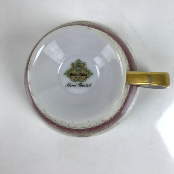 This is a vintage Japanese porcelain Meito China teacup. It is the "Mandarin" pattern which features a rich burgundy-red color on the outside with handainted gold designs of flowers and plants. It is a very regal style. The inner rim has a patterned gold border.  There is a maker's stamp on the bottom that reads "Meito China Japan Hand Painted".