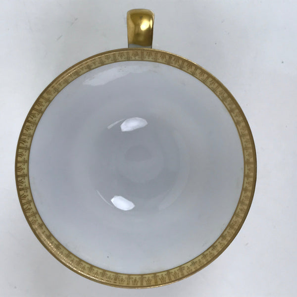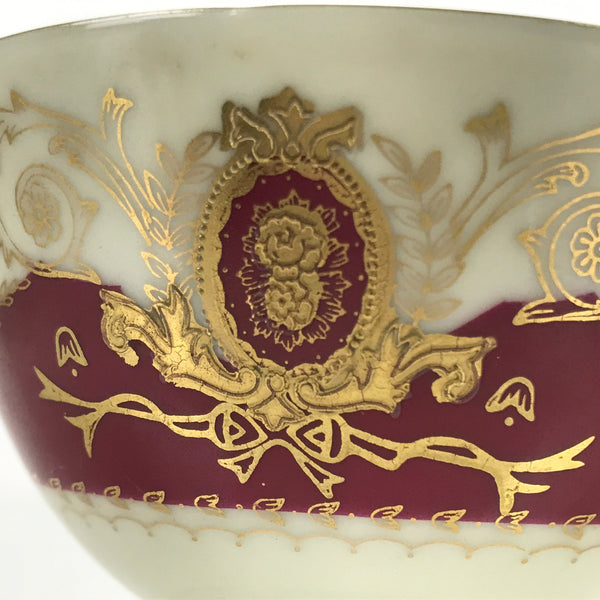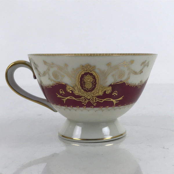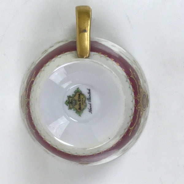 This is a vintage Japanese porcelain Meito China teacup. It is the "Mandarin" pattern which features a rich burgundy-red color on the outside with handainted gold designs of flowers and plants. It is a very regal style. The inner rim has a patterned gold border.  There is a maker's stamp on the bottom that reads "Meito China Japan Hand Painted".